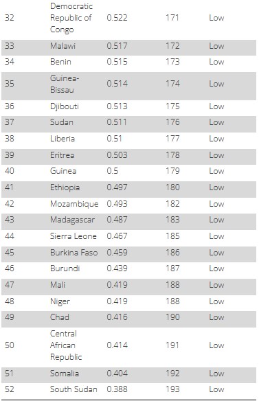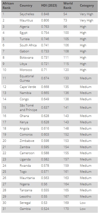 Nineteen African countries are in the “medium human development” category, with scores ranging from 0.500 to 0.590. This group includes Senegal (0.530), Gambia (0.524), the Democratic Republic of Congo (0.522), and Malawi (0.517). These nations have shown modest progress but continue to face persistent challenges related to poverty, the quality of their education systems, and access to healthcare.