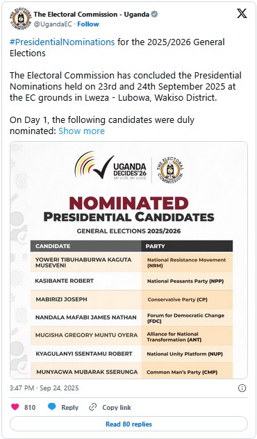 The final list, published on September 24, includes President Yoweri Museveni, 81, who has ruled since 1986 and is seeking a seventh term under the ruling National Resistance Movement (NRM). His challengers are Robert Kasibante (NPP), Joseph Mabirizi (CP), James Nathan Nandala Mafabi (FDC), Gregory Mugisha Muntu Oyera (ANT), Robert Kyagulanyi Ssentamu, better known as Bobi Wine, Mubarak Munyagwa Sserunga (CMP), and Frank Kabinga Bulira (RPP).