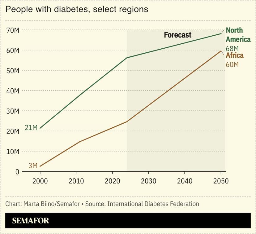 A new study published in The Lancet projected that Type 2 diabetes cases in sub-Saharan Africa would more than double to nearly 55 million by 2045, driven by the shifting diets and decline in physical activity also seen in other parts of the world. In February, policymakers, academics, and philanthropists gathered in Kigali to discuss the rise of noncommunicable diseases, with Type 2 diabetes emerging as a particular concern.